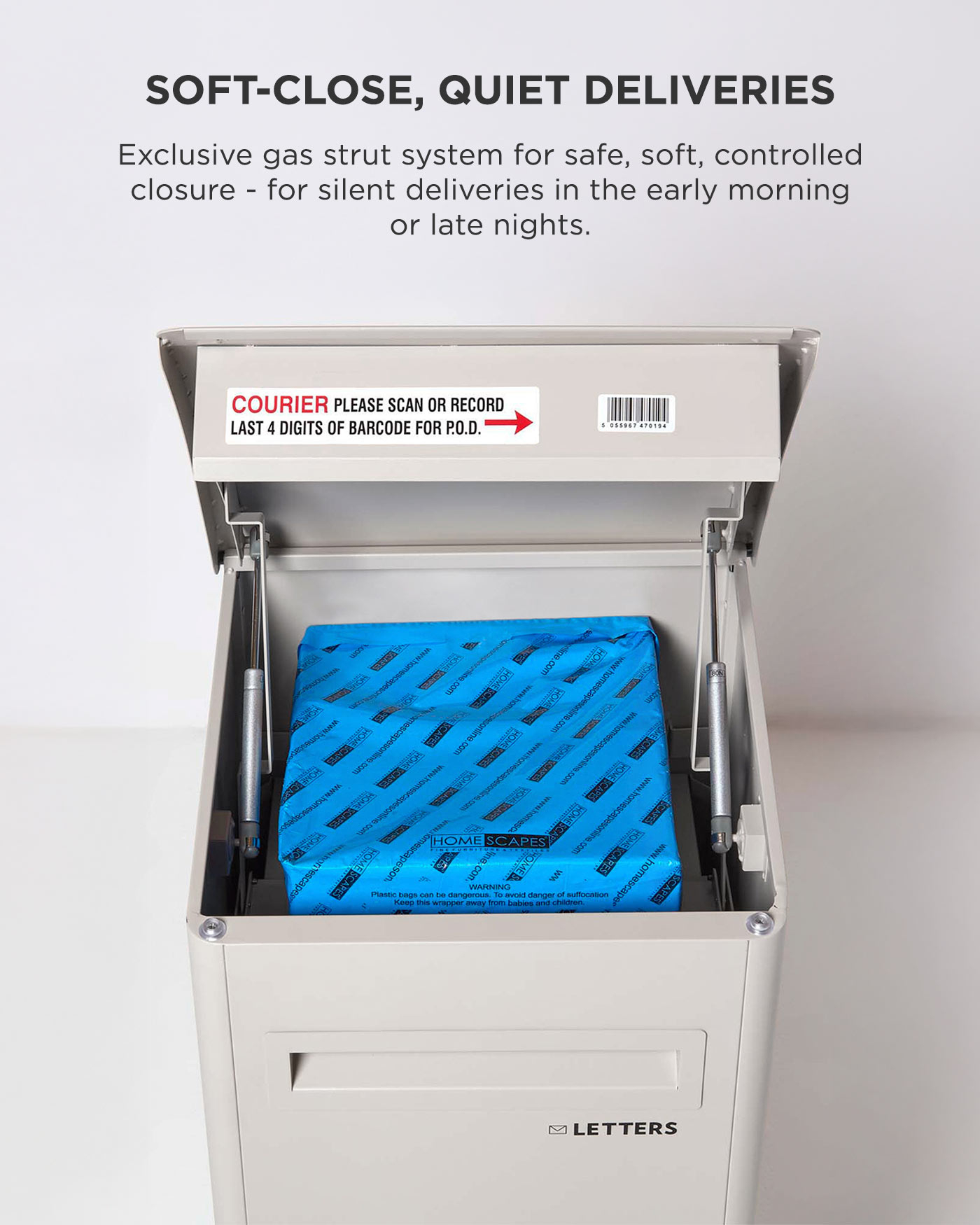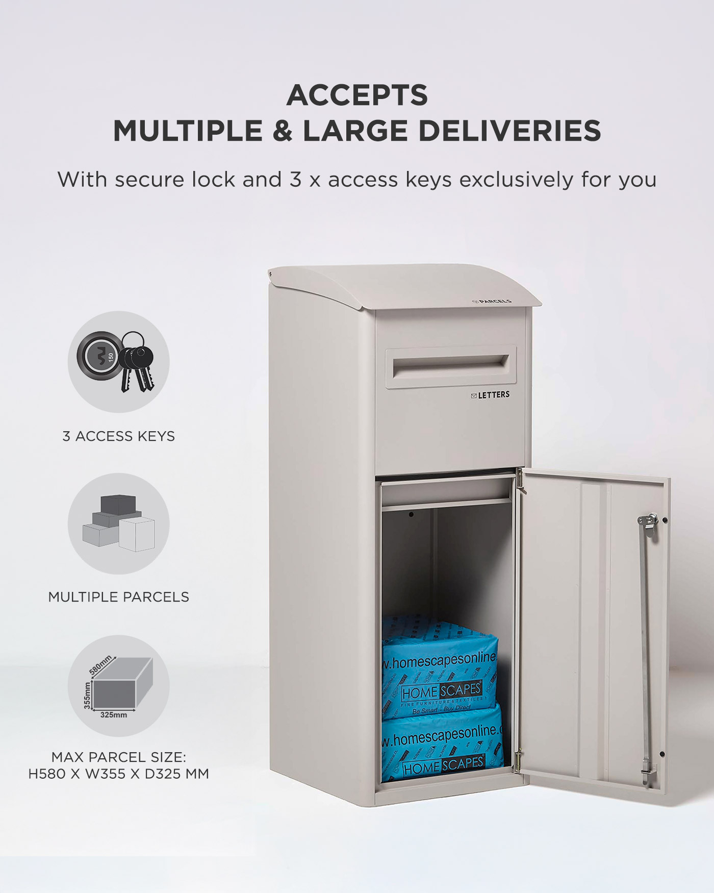 Extra-large delivery drop box that will safely and securely receive parcels and letters when you are away from home. From the Smart Parcel Box® range, this modern style delivery box is manufactured from strong galvanised steel and finished in a latte stone, rust-resistant powder coating. Finished with a slanted roof to perfect rain water sitting during bad weather, this stylish delivery box will introduce a contemporary look into your garden or entrance way. Simple to use, couriers and postmen lift lid of the Smart Parcel Box® and deliver your parcels. After closing the lid, your deliveries slide down into the secure holding compartment.