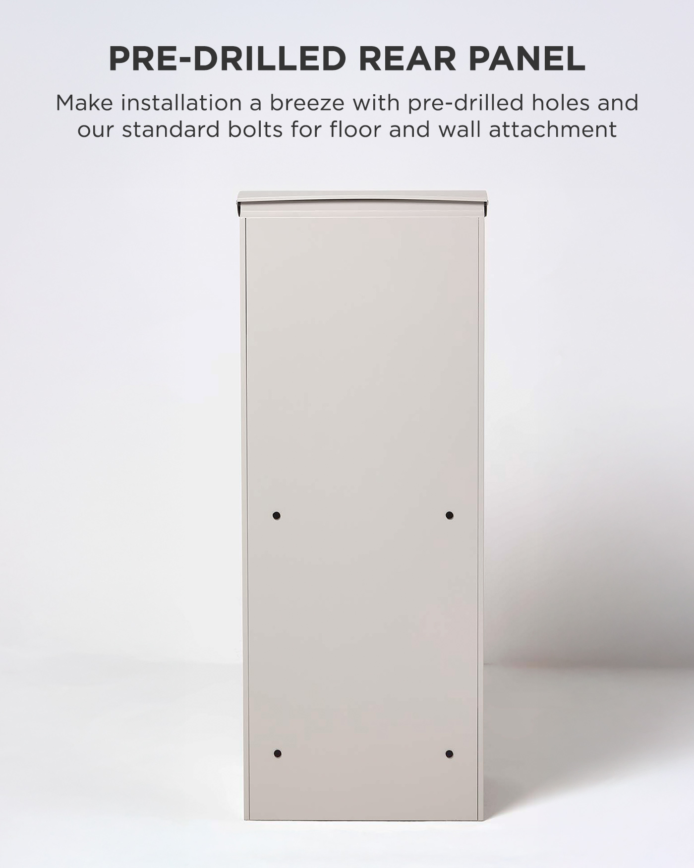 A unique and smart delivery drop box that can be used at home or by businesses, the Smart Parcel Box® features a secure anti-fishing mechanism, keeping the contents safe. Each box also has a unique barcode which can be scanned and recorded and used as proof of delivery. When you return home, simply use one of your unique access keys (3 keys are provided) to open the lower holding compartment door and retrieve your deliveries. Ideal for those who regularly receive parcels, this extra-large drop box can receive multiple deliveries from multiple couriers on a daily basis. Easy to install, it can be wall or floor mounted with fixtures and fittings supplied, please ensure they are suitable for your property before installing. The box also includes a thick PVC cushion for the floor of the box's lower compartment to help cushion parcels when they are delivered.