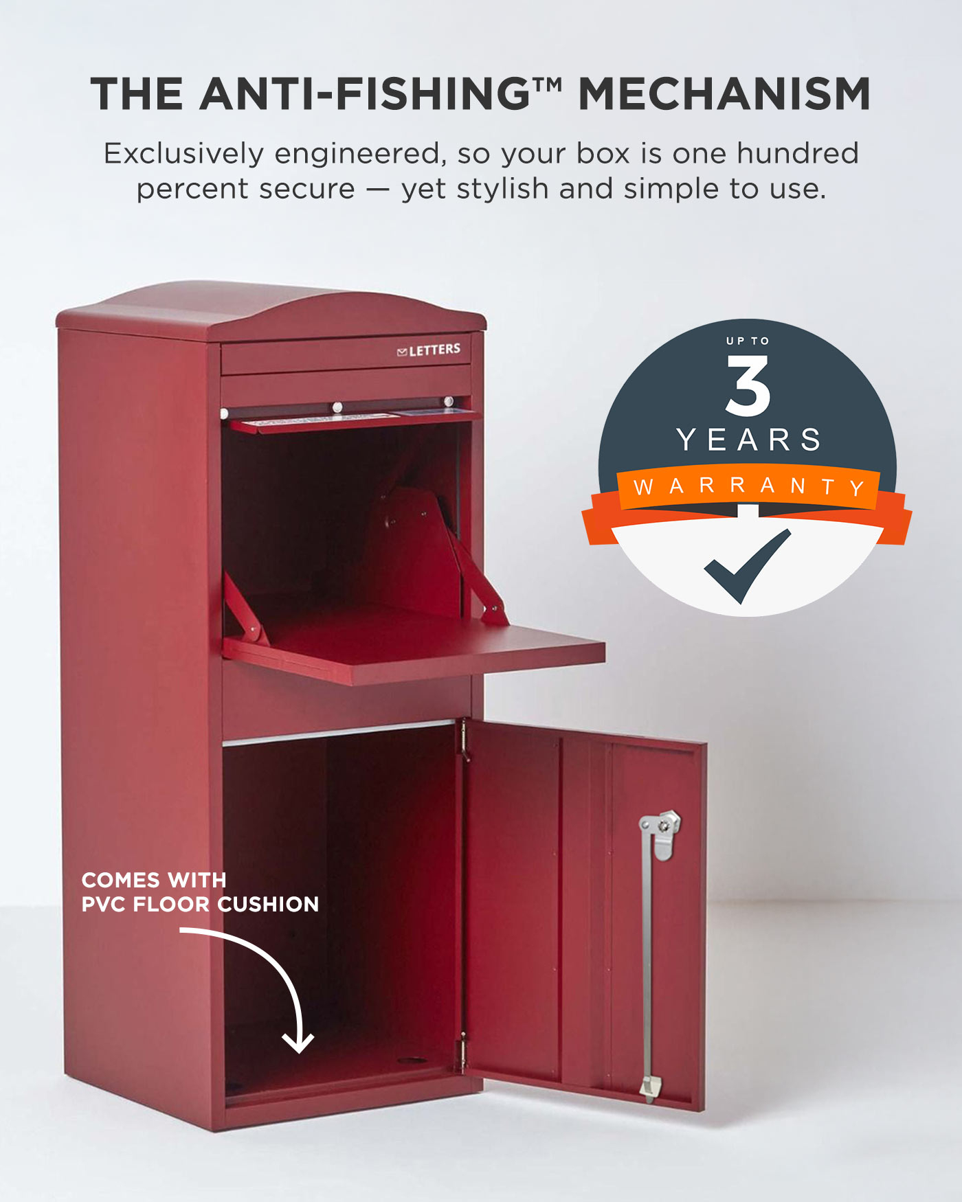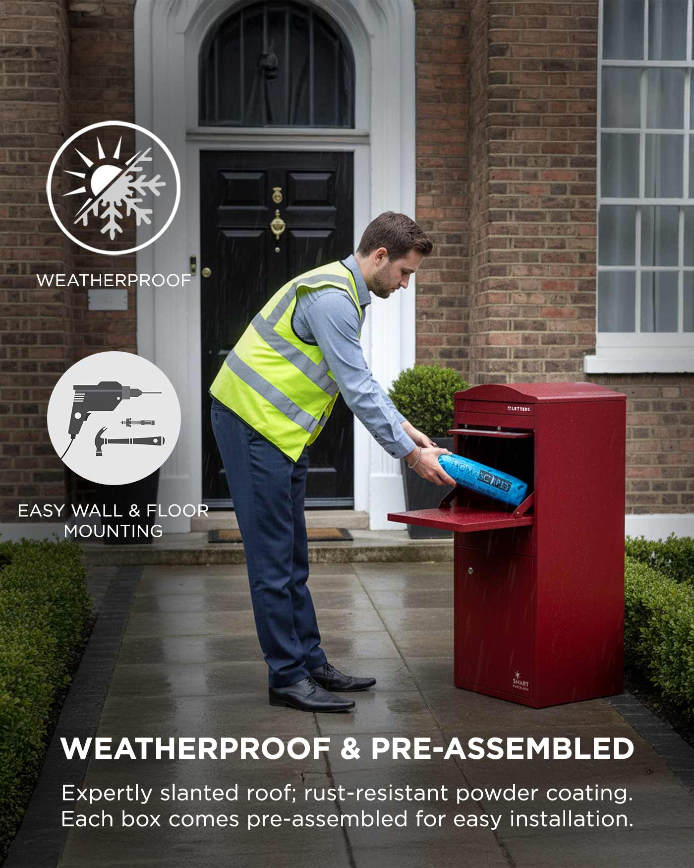 Manufactured from a strong galvanised steel, the delivery box is finished in a rust-resistant deep red powder coating. Designed to withstand the Great British weather, the delivery drop box is entirely weatherproof and sits on floor raisers, furthermore the sleek curved roof, prevents water from pooling on top of the box. Easy to install, the large Smart Parcel Box® can be fixed into the floor or onto a wall or gate and the box comes with fixtures and fittings (please check beforehand if they are suitable for your property). Perfect for business and small or large homes, installing a Smart Parcel Box® will mean you never have to miss a delivery again. The box also includes a thick PVC cushion for the floor of the box's lower compartment to help cushion parcels when they are delivered.