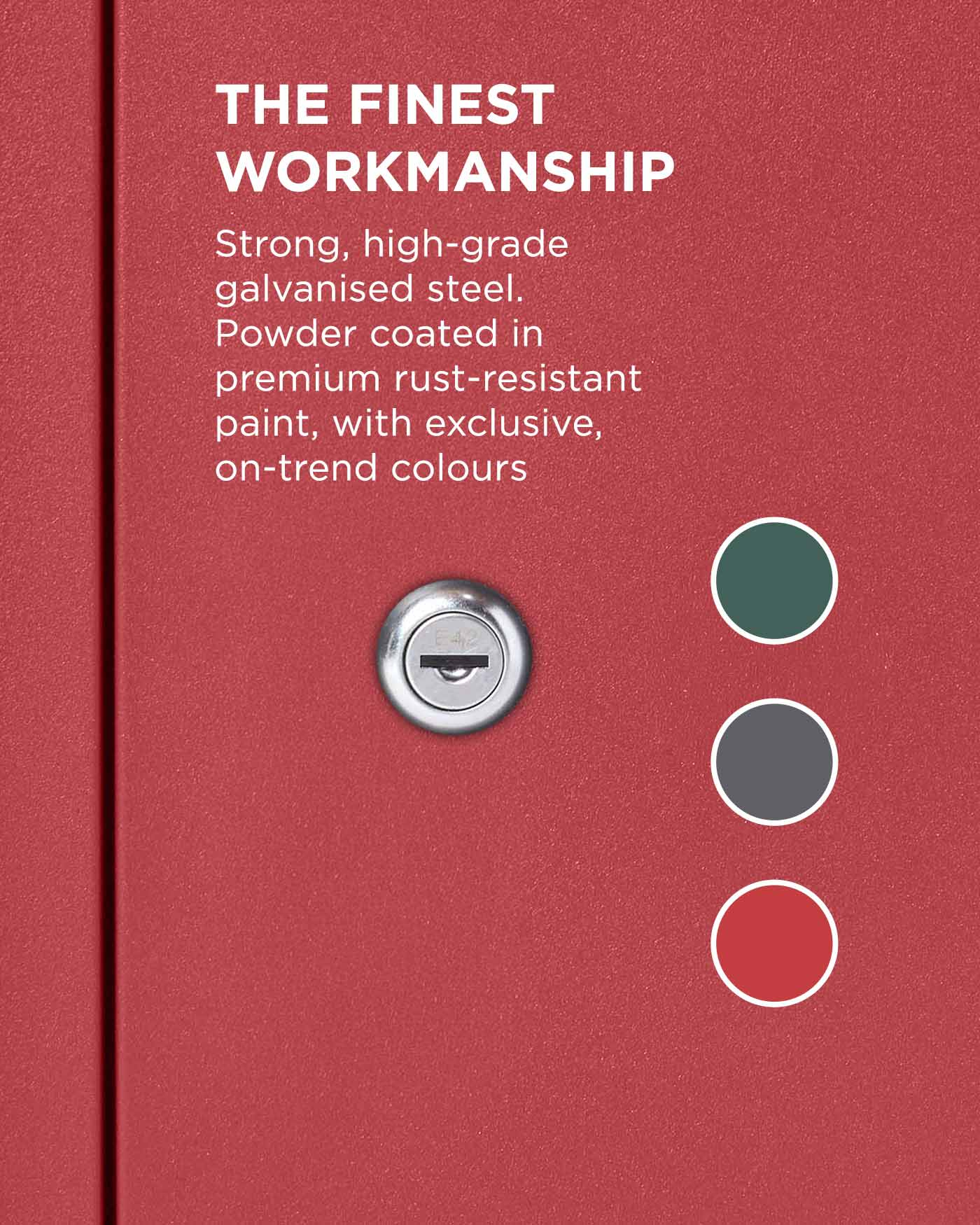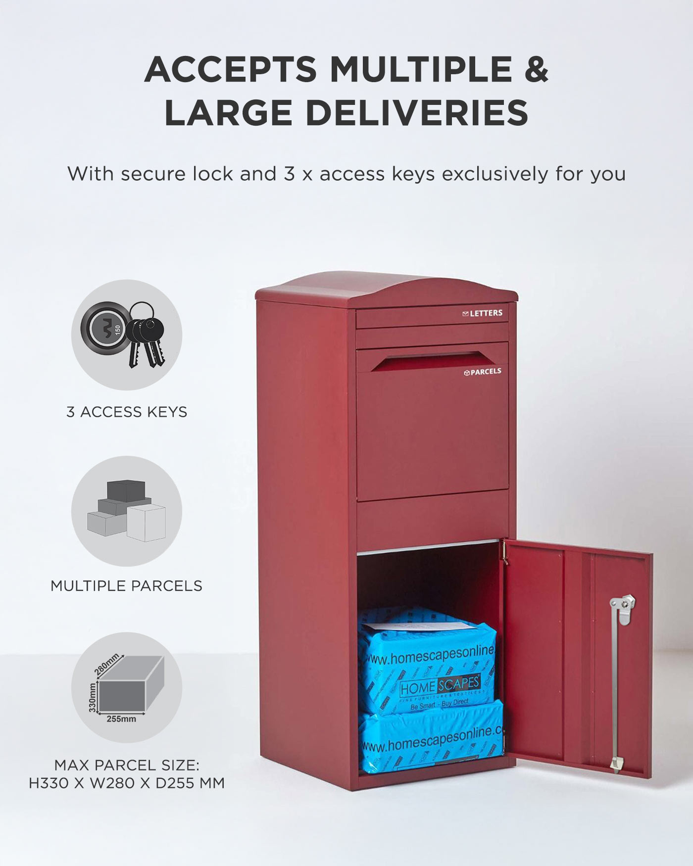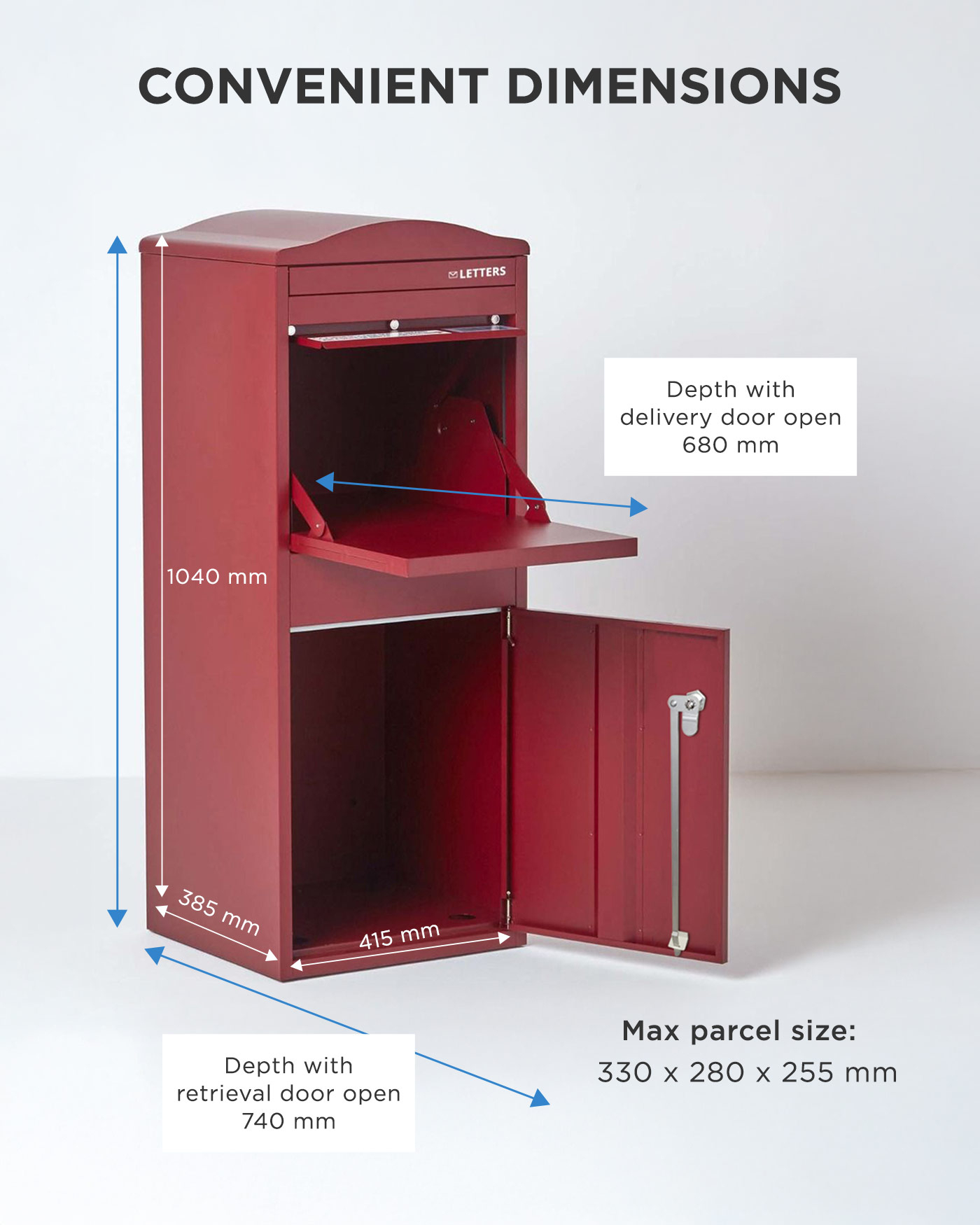 The safe and secure way to receive parcels when you are not at home, the large red Smart Parcel Box® is a stylish addition to any business or home. Measuring just over 1 metre tall, this large box will receive multiple deliveries on your behalf throughout the day. Easy to use, parcels are posted through the top delivery hatch, your delivery then moves into the lower holding compartment where it sits until you return. A secure way to receive parcels to your door, each box features an anti-fishing mechanism, ensuring that your deliveries remain safe and a unique barcode which can be scanned or recorded and used as proof of delivery. To retrieve your parcels, simply use your unique access key (3 are supplied with each box) to open the holding compartment and collect your parcels and letters.