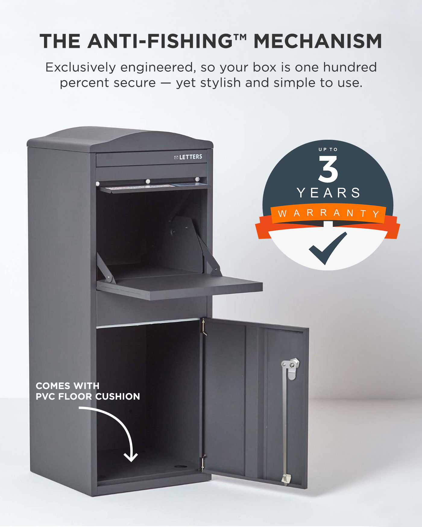 Easily receive parcels when you are not at home with the safe and secure Smart Parcel Box® . A stylish addition to any home, this dark grey delivery box measure just over 1 metre tall and will accept multiple deliveries throughout the day. Easy to use, deliveries are posted through the top hatch, once closed, the moved down into the lower holding compartment, where they remain secure until you return home. Each box features an anti-fishing mechanism, ensuring that deliveries remain safe and untouchable whilst in the box. The Smart Parcel Box® also comes with a unique barcode which can be scanned or recorded and used as proof of delivery should your parcel require it. When you return home, simply use your unique access key (each box is supplied with 3 keys) to open the holding compartment door and retrieve your parcels and letters.