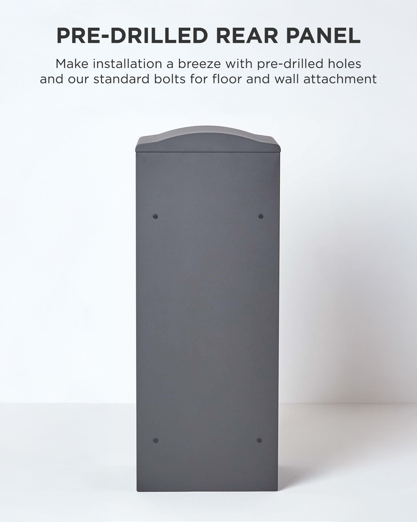 Expertly manufactured from a super strong galvanised steel, this large delivery drop box is finished in a rust-resistant dark grey powder coating. Fully weatherproof, the box is designed to withstand the Great British weather, sitting on floor raisers and also having a stylish curved roof which will prevent water from pooling. Quick and simple to install, each box comes with fixtures and fitting (please ensure these are suitable for your property) and can be installed onto a wall or into a floor. Ideal for both homes and businesses, it is the perfect solution for safely and securely receiving parcels direct to your door. The box also includes a thick PVC cushion for the floor of the box's lower compartment to help cushion parcels when they are delivered.